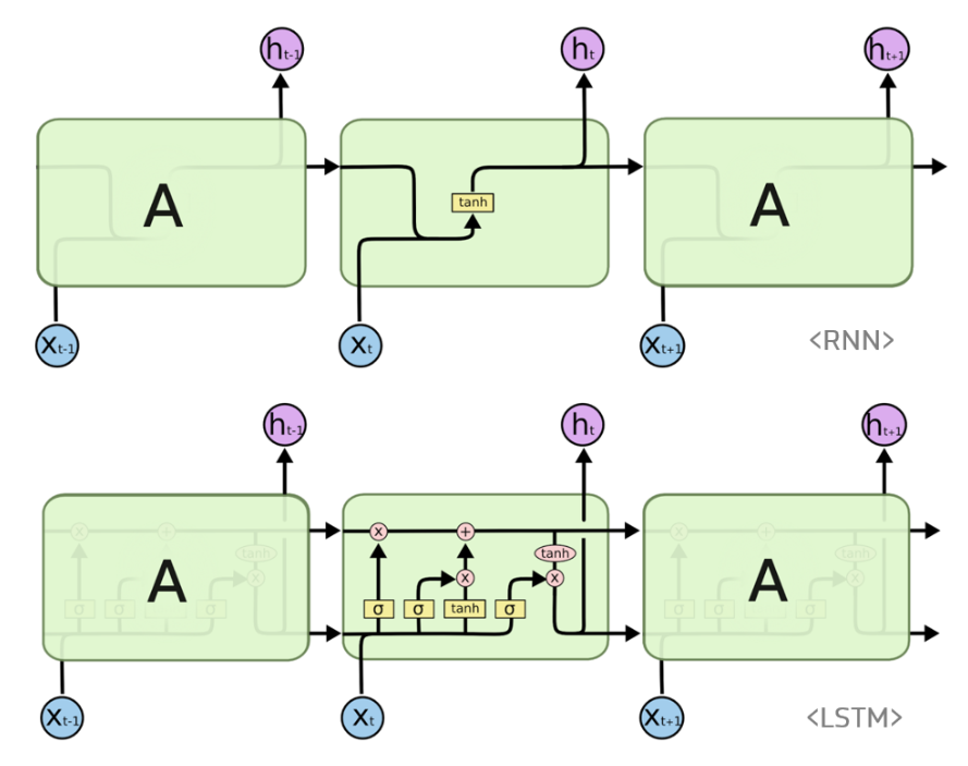 크기가 큰 데이터를 사용할 때 RNN에서 발생하는 vanishing gradients, gradient explosion과 같은 문제를 해결하기 위한 변형 알고리즘이 LSTM이다. 예를 들어 위의 이미지를 보아도 길이가 긴 문장을 사용할 때에는 RNN의 기본 모델로는 초반 부분에 대한 데이터를 모두 다 기억하고 있기 어려운 부분이 있다. LSTM이라는 이름에서 알 수 있듯이 손실되는 데이터들을 메모장에 필기하듯이 저장해두는 방식으로, 내부셀에 선형 레이어 대신 각각에 작은 네트워크를 만들어 장/단기간으로 정보를 기억할 수 있는 모델을 만들었다.