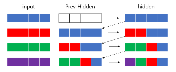 위의 이미지에서처럼 RNN 모델의 한 셀에서 State vector (초록), Output vector (파랑)를 출력한다. 이 Previous Hidden Vector를 사용하는 이유는 아래 이미지로 쉽게 이해가능하다. 이전 input을 기준으로 계속 넣어준다면 모든 데이터를 알기어렵겠지만, Previous Hidden 방식으로 최종 Output에 모든 input data들을 다 함축해 가지고 있는것을 볼 수 있다. 이처럼 RNN은 이전의 Hidden data를 포함하게끔 하는 딥러닝 뉴럴 네트워크 구조이다. (첫 Hidden은 0으로 초기화함). 만약 input - prev_Input 관계로 되어있었다면 마지막은 보라2/초록2이 될 것 이다.