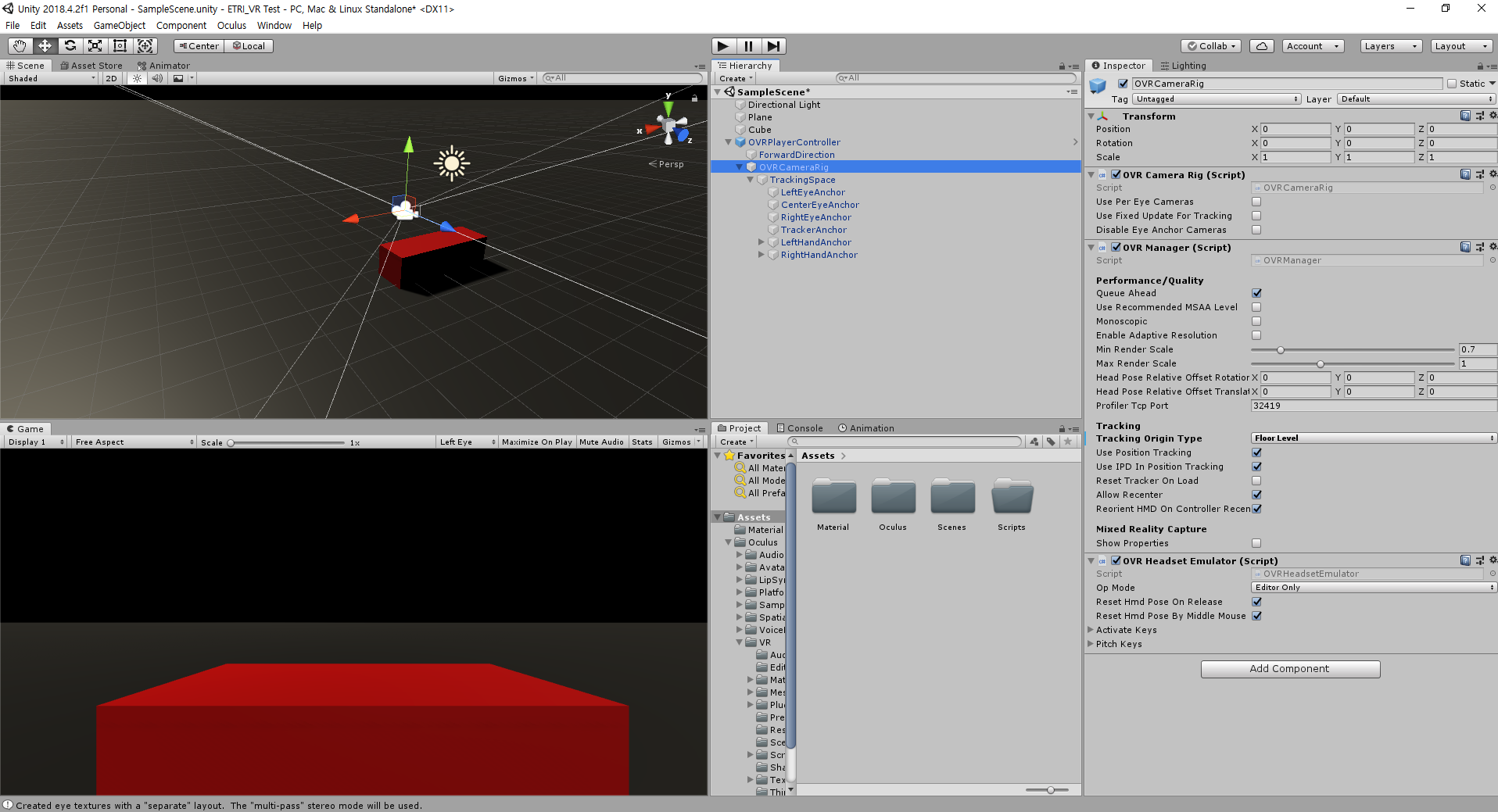 3. 기존의 Camera를 지우고, OVRPlayerController를 불러오고, 하위 OVRCameraRig에서 Tracking의 Origin Type을 Floor Level로 설정해줍니다.
