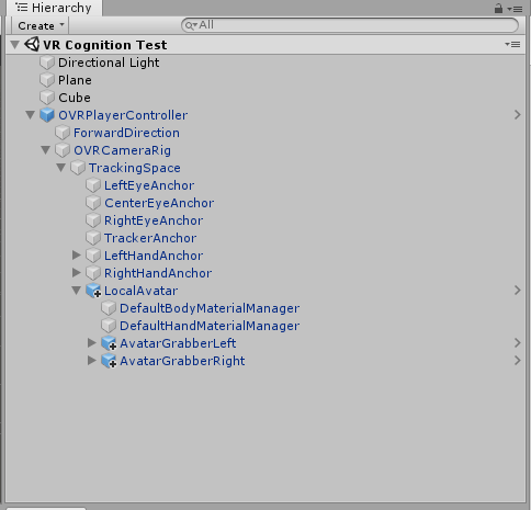 5. 아래 구조처럼 LocalAvatar, AvatarGrabberLeft & Right를 추가해주고 실행하면 손, 움직임등이 작동합니다.